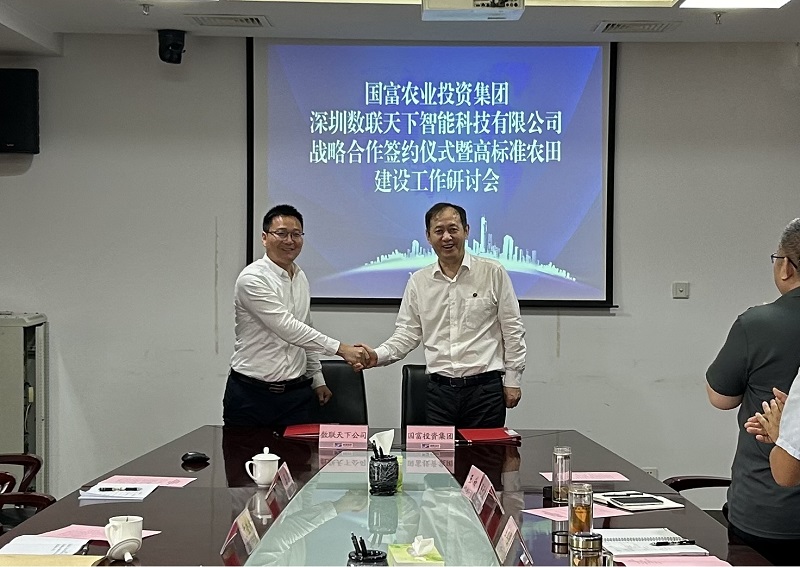 7月2日,國富農業投資集團與深圳數聯天下智能科技有限公司簽訂戰略合作協議,為國富農業投資集團加快培育農業新質生產力、打造省內一流高標準農田建設項目注入科技新活力。國富農業投資集團黨委副書記、副董事長、總經理張立忠,集團黨委常委、常務副總經理馬國棟,集團黨委委員、副總經理李其強,及相關業務骨干同數聯天下副總裁鄧才良一行進行工作研討并見證簽約儀式。