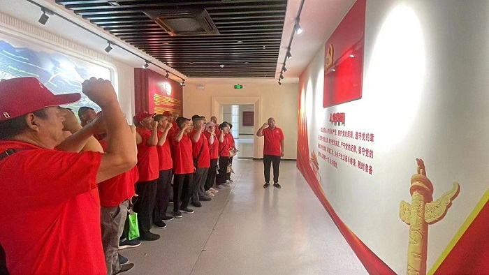 在紀念館內,黨員們面對鮮紅的黨旗,一起高舉右手,再次重溫入黨誓詞,鏗鏘恢宏的誓詞,使每一位黨員再次接受了心靈洗禮,銘記莊嚴承諾,牢記共產黨員的責任擔當和光榮使命。