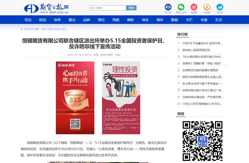 2022年5月為第三屆全國防范非法證券期貨宣傳月,本屆防非宣傳月的主題為“選擇合法機構,遠離非法主體,堅持理性投資,謹防上當受騙”。為進一步加大防范非法證券期貨宣傳力度,提示非法證券期貨活動風險,增強人民群眾對非法證券期貨活動的防范意識和能力,恒銀期貨有限公司(以下簡稱“恒銀期貨”)在河北證監局、河北省證券期貨業協會的指導下,組織了“五個走進”系列活動,走進了校園、社區、企業進行了系列反詐防非活動,并以此為契機宣傳期貨相關知識,發揮期貨公司服務實體經濟發展的專業價值。